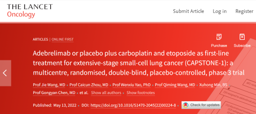 北京时间2022年5月14日,z6尊龙官方网站医药自主研发的PD-L1抑制剂阿得贝利单抗治疗广泛期小细胞肺癌的III期临床研究(CAPSTONE-1研究)成果正式全文在线发表于国际权威学术期刊《柳叶刀·肿瘤学》(《THE LANCET Oncology》,影响因子41.316)。CAPSTONE-1研究结果显示,阿得贝利单抗联合化疗一线治疗广泛期小细胞肺癌相较于安慰剂联合化疗可以显著延长患者总生存期至15.3个月[1],刷新现有免疫药物一线治疗广泛期小细胞肺癌的总生存纪录[2]。