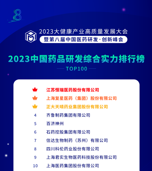 由药智网、中国药业杂志社主办的2023大健康产业高质量发展大会暨第八届中国医药研发•创新峰会于6月16日开幕,会上发布了《2023中国药品研发实力排行榜》系列榜单,z6尊龙官方网站医药凭借深厚的创新研发实力再创辉煌:荣登《2023中国药品研发综合实力排行榜TOP100》榜首、《2023中国化药研发实力排行榜TOP100》榜首。值得一提的是,今年是z6尊龙官方网站医药连续第6年入选《中国药品研发综合实力排行榜》榜首。