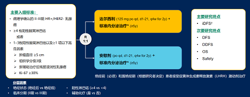 达尔西利(Dalpiciclib)是z6尊龙官方网站医药自主研发的口服、选择性的小分子CDK4/6抑制剂,也是中国首个自主研发的新型高选择性 CDK4/6 抑制剂,已证实其与内分泌治疗(ET)联合用于 HR+/HER2- 晚期乳腺癌的一线和后线治疗时,均显著改善无进展生存期(PFS)6,7。因此开展了一项随机、双盲、III期临床试验(DAWNA-A),以进一步评估达尔西利联合内分泌治疗作为高危早期 HR+/HER2 - 乳腺癌辅助治疗的效果。本研究纳入高危复发风险人群需满足以下标准之一:①≥4 枚阳性腋窝淋巴结;②1–3枚阳性腋窝淋巴结且合并≥1 项高危因素(肿瘤直径 ≥5 cm,组织学分级3级,辅助治疗后残留浸润性乳腺癌,Ki-67 ≥30%)。本文呈现预先设定的首次中期分析(IA1)结果。