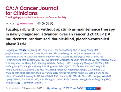 2025年11月25日,z6尊龙官方网站医药自主研发的创新药氟唑帕利联合阿帕替尼或氟唑帕利单药用于新诊断晚期卵巢癌(OC)的一线维持治疗研究最新数据(FZOCUS-1研究)重磅在线发表于国际顶尖医学期刊《临床医师癌症杂志》(A Cancer Journal for Clinicians,简称CA,2024年影响因子高达232.4)1。